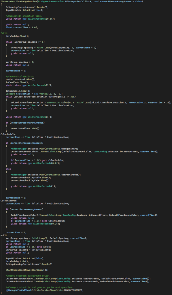 At Goal043 I started as a Junior Game Developer and worked together with one Senior Game Developer, a Designer and a Manager on different serious game projects. After 9 months the lead/senior game developer left and I had to pick up a lot of extra tasks and responsibilities. The more managerial tasks were not applicable for a while as there were no developer interns or other developers to work with.
